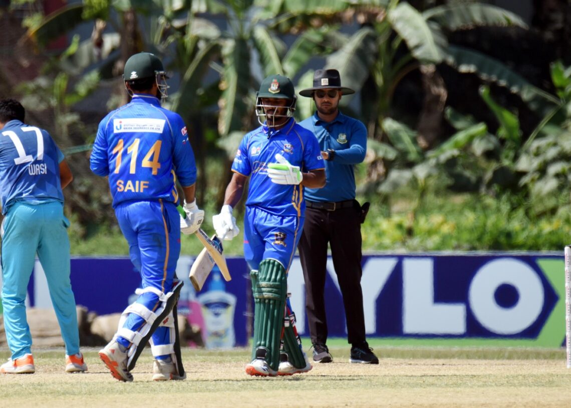 জবাবে ব্যাটিংয়ে নেমে ওপেনার সাইফ হাসান ও তানজিদ হাসান তামিমের অপরাজিত জুটিতে মাত্র ১৩.৫ ওভারে বিনা উইকেটে ৯৭ রান তোলে তারা। সাইফ হাসান ২৭ ও তামিম ৬৫ রান করে অপরাজিত থাকেন।