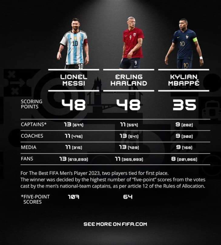 ব্যালন ডি অর লড়াইয়ে যে আর্লিং হালান্ড ও কিলিয়ান এমবাপে তার প্রতিদ্বন্দ্বী ছিলেন এখানেও তার ব্যতিক্রম হয়নি। এই দুই তারকাকে পেছনে ফেলেই ফিফা দ্য বেস্ট হয়েছেন মেসি।