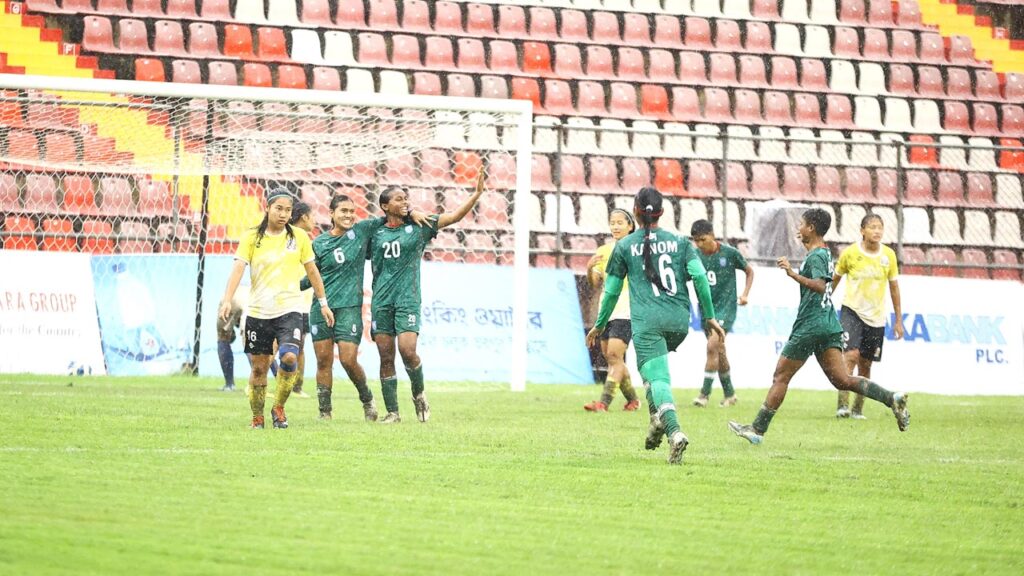 সাফ অনূর্ধ্ব-২০ নারী ফুটবল টুর্নামেন্টে সোমবার অনুষ্ঠিত বাংলাদেশ-ভুটান ম্যাচ হয়ে থাকল স্মরণীয় এক নাটকীয়তায় ভরা অধ্যায়। বসুন্ধরা কিংস অ্যারেনায় শুরু হওয়া ম্যাচ শেষ হয়েছে পাশের অনুশীলন মাঠে, বৃষ্টির কারণে। বিরল এই ঘটনায় ৪ ঘণ্টার বেশি সময় ধরে চলা ম্যাচ শেষে ৪-১ গোলের জয়ে মাঠ ছেড়েছে স্বাগতিক বাংলাদেশ।