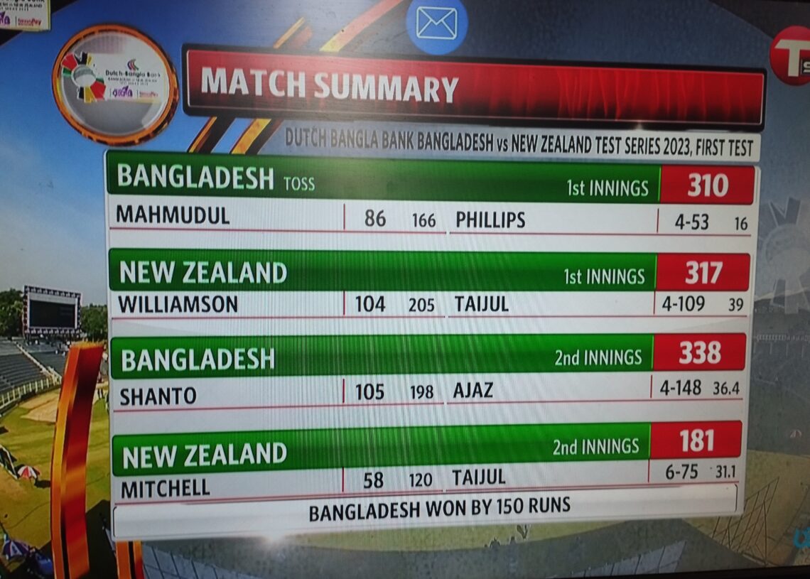 মূলত টেস্টের চতুর্থ দিন শেষেই জয়ের সুবাস পাচ্ছিলো বাংলাদেশ দল। ৩৩২ রানের জয়ের টার্গেটে দ্বিতীয় ইনিংসে খেলতে নেমে শুরুতেই বাংলাদেশী বোলারদের নিয়ন্ত্রিত বোলিংয়ে নিয়মিত উইকেট হারাতে থাকে কিউই ব্যাটাররা। সময় যতই গড়াচ্ছিলো ম্যাচে বাংলাদেশের নিয়ন্ত্রণ ততই প্রতিষ্ঠিত হচ্ছিলো। এই অবস্থায় ৭ উইকেটে ১১৩ রান নিয়ে চতুর্থ দিনের খেলা শেষ করে টিম সাউদির দল।
