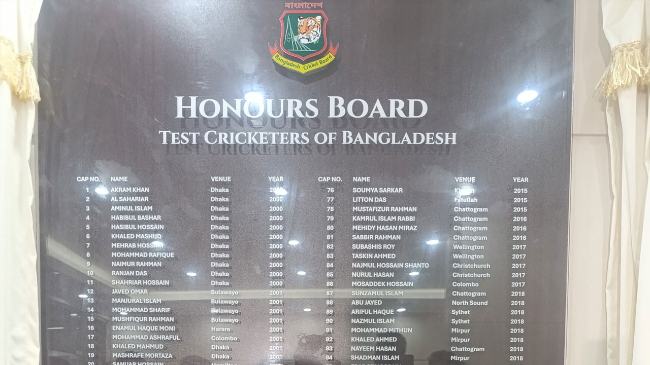 এই অনার্স বোর্ডে স্থান পেয়েছেন ২০০০ সাল থেকে এখন পর্যন্ত টেস্ট খেলা প্রতিটি বাংলাদেশি ক্রিকেটার। বোর্ডে রয়েছে ক্রিকেটারদের টেস্ট ক্যাপ নাম্বার, অভিষেকের মাঠ এবং বছর। আকরাম খান, হাবিবুল বাশার, মোহাম্মদ রফিক, মাশরাফি বিন মুর্তজা থেকে শুরু করে সাকিব আল হাসান, তামিম ইকবাল, লিটন দাস, এমনকি সদ্য অভিষিক্ত নাহিদ রানা ও নাঈম হাসান পর্যন্ত সবার নাম সেখানে অমর হয়ে রইলো।