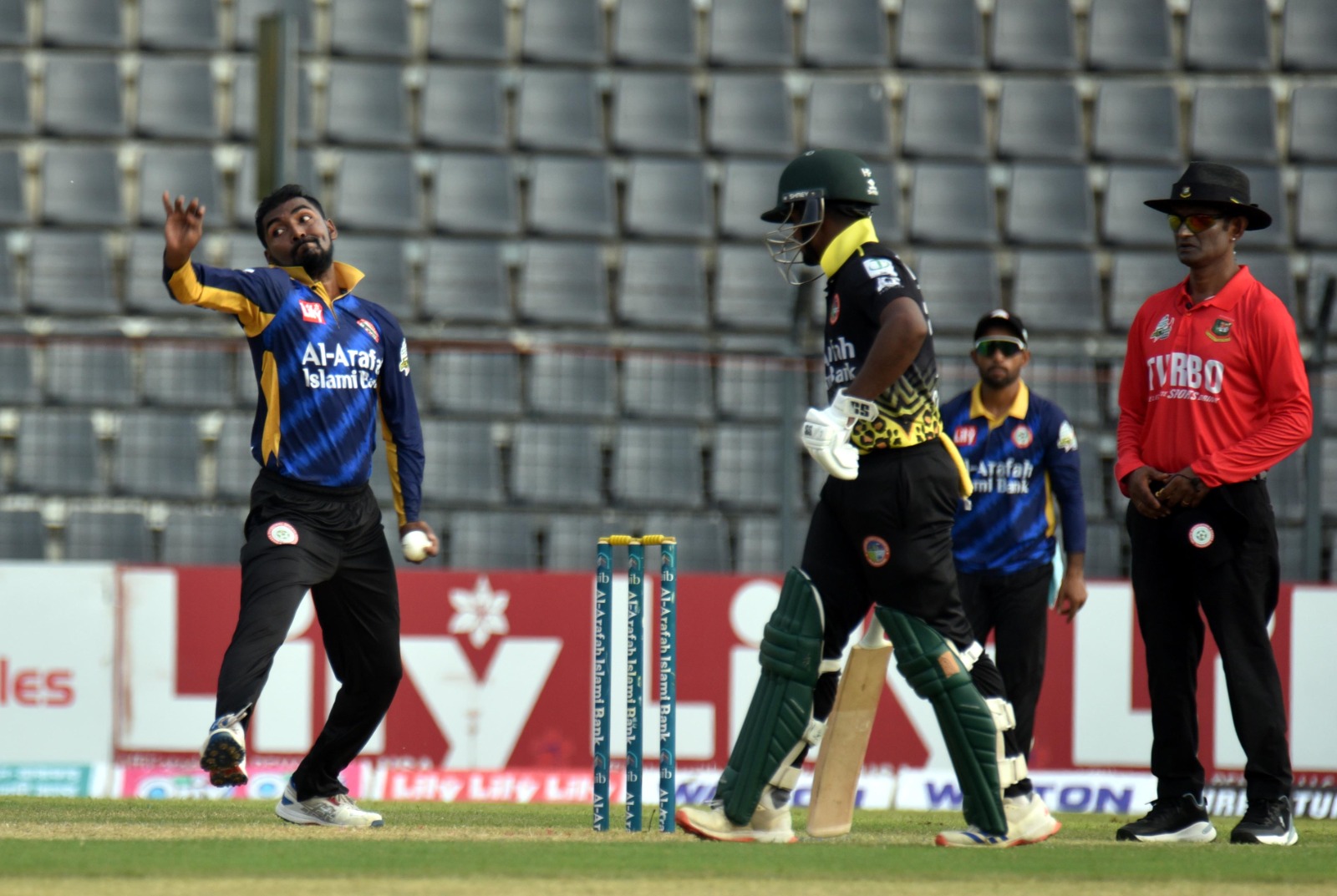 দিশান ১৬, অধিনায়ক জাকির ১৯, খালিদ হাসান ২৪, অমিত হাসান ২৪ ও গালিব ২৩ রানে আউট হন।