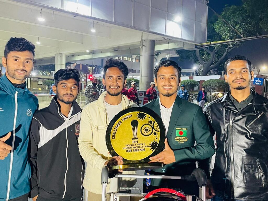 হকির যে-কোনো পর্যায়ে এবারই প্রথম বিশ্বকাপ খেলেছে বাংলাদেশ জুনিয়র হকি দল। তামিলনাড়ুতে অনুষ্ঠিত এই জুনিয়র হকি বিশ্বকাপে (যুব বিশ্বকাপ) বাংলাদেশের যুবারা চ্যালেঞ্জার ট্রফি জিতেছে। আজ বিজয়ী দল দেশে ফেরার পর বিমানবন্দরে উষ্ণ অভ্যর্থনা জানান ডাকসু ক্রীড়া সম্পাদক আরমান।