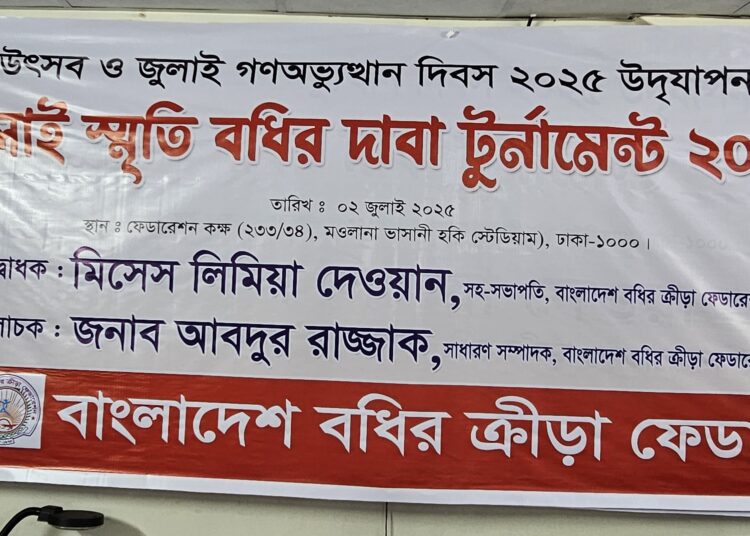 তারুণ্যের উৎসব ও জুলাই গণঅভ্যুত্থান দিবস ২০২৫ উদযাপন উপলক্ষে জুলাই স্মৃতি বধির দাবা টুর্নামেন্ট ২০২৫ এর আয়োজন করেছে বাংলাদেশ বধির ক্রীড়া ফেডারেশন।