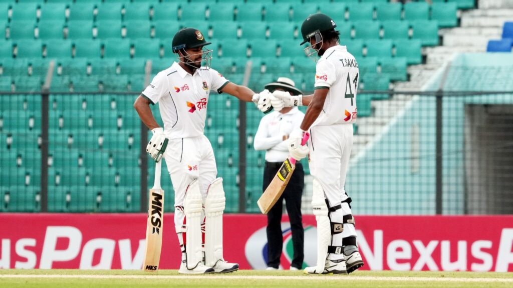 অভিষিক্ত তানজিম হাসান সাকিব মিরাজের সঙ্গে জুটি গড়ে দারুণ ব্যাটিং উপহার দিচ্ছেন। ১৫৬ বলে ৯৬ রানে জুটি গড়েন এই পেসার। দারুণ ব্যাটিং উপহার দিয়ে মিরাজের সেঞ্চুরির আগেই দলীয় ৪৩৮ রানের মাথায় ব্যক্তিগত ৪১ রান করে বিদায় নেন সাকিব। ৮০ বলে দুই বাউন্ডারি ও এক ছক্কায় এ রান করেন তিনি।