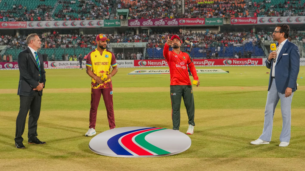 টস হেরে ফিল্ডিংয়ে বাংলাদেশ। সিরিজে টানা দ্বিতীয় ম্যাচে টস জিতলেন শেই হোপ। আবারও ব্যাটিং নিলেন ওয়েস্ট ইন্ডিজ অধিনায়ক। হেরে যাওয়া প্রথম ম্যাচের একাদশ থেকে একটি পরির্তন এনেছে বাংলাদেশ। নুরুল হাসান সোহানের জায়গায় ফিরেছেন আরেক মিডল অর্ডার ব্যাটসম্যান জাকের আলি।
