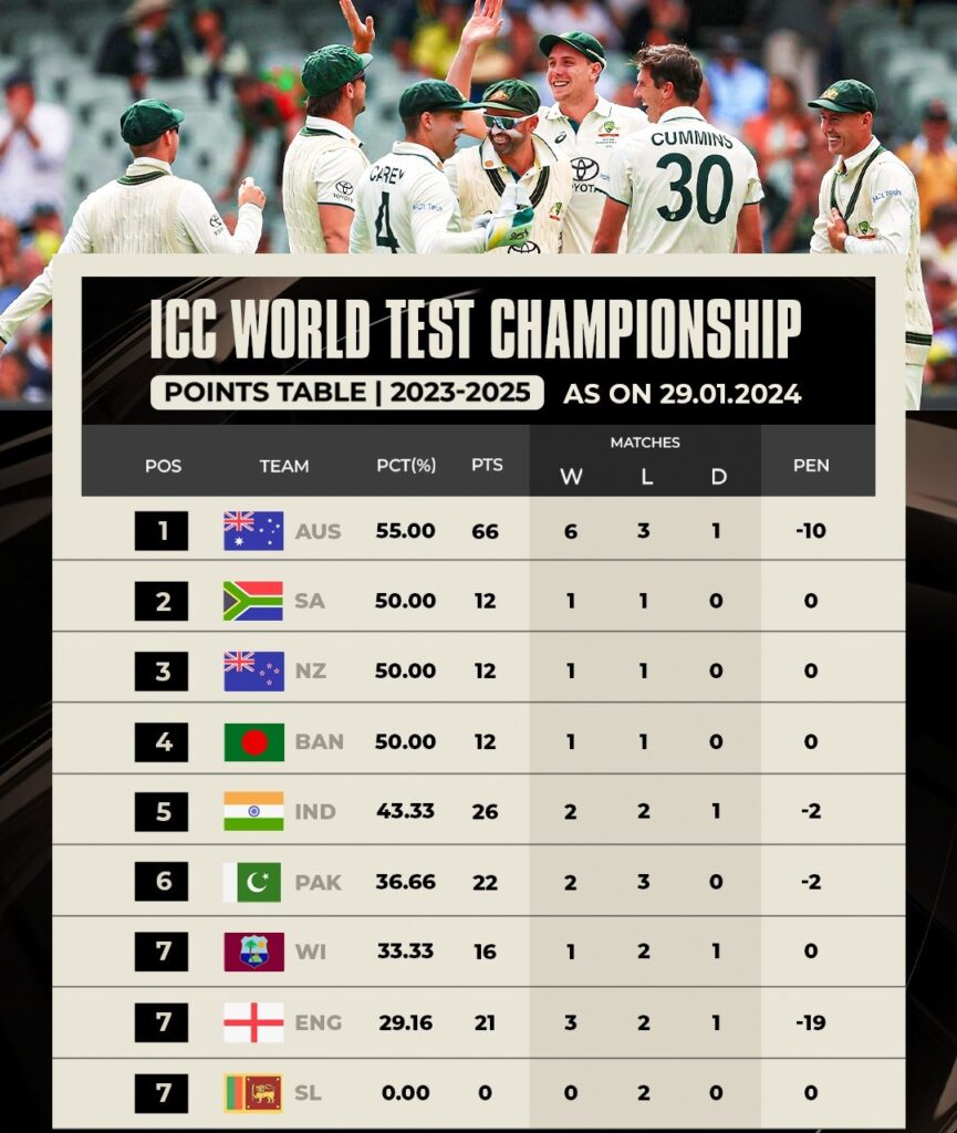অবশ্য একই দিনে গাব্বা টেস্টে ৮ রানের নাটকীয় হারের পরেও পয়েন্ট টেবিলের শীর্ষস্থান দখল করে রেখেছে অস্ট্রেলিয়া।