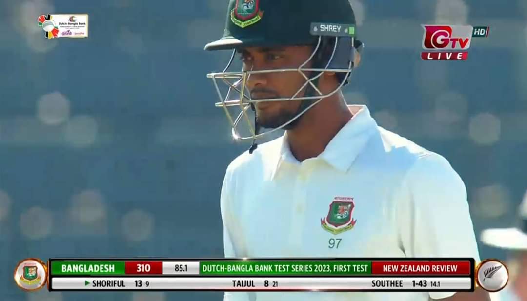 ৯ উইকেটে ৩১০ রান নিয়ে প্রথম দিনের খেলা শেষ করেছিলো বাংলাদেশ। দ্বিতীয় দিনের শুরুর বলেই শরিফুল আউট হলে ৩১০ রানেই শেষ হয় বাংলাদেশের প্রথম ইনিংস।