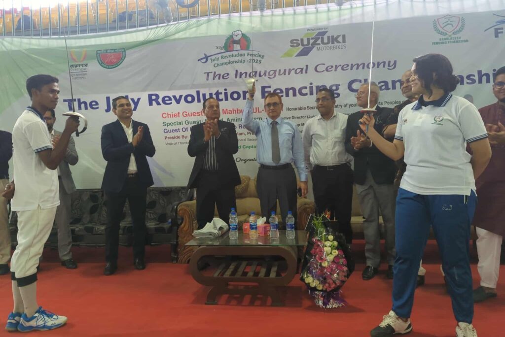 শুক্রবার শহীদ ক্যাপ্টেন এম মনসুর আলী হ্যান্ডবল স্টেডিয়ামে শুরু হয়েছে জুলাই রেভুলেশন ফেন্সিং চ্যাম্পিয়নশিপ। এই প্রতিযোগিতায় প্রথমবারের মতো স্পনসর করছে বিখ্যাত মোটরবাইক ব্র্যান্ড সুজুকি। আর প্রতিযোগিতার উদ্বোধনী অনুষ্ঠানে এসেই নিজেদের আকর্ষণীয় সুজুকি মোটরসাইকেল পুরস্কার দেওয়ার ঘোষণা দিয়েছেন র্যানকন গ্রুপের গ্রুপ ব্যবস্থাপনা পরিচালক রোমো রউফ চৌধুরী।