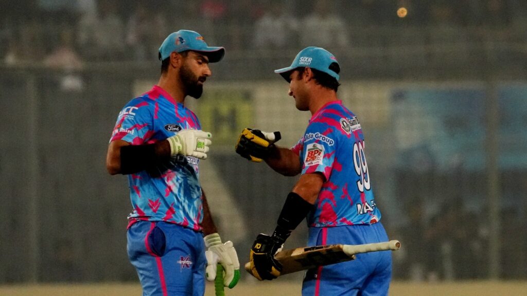 এদিন টস হেরে ব্যাটিংয়ে নেমে ওপেনিং জুটিতে ঝড় তোলেন পারভেজ হোসেন ইমন ও খাওজা নাফায়ে। অবশেষে দলীয় ১৪১ রানের মাথায় প্রথম উইকেটে হারায় তারা। খাওজা ওপেনিংয়ে ব্যাট করতে ৪৪ বলে সাত বাউন্ডারি ও তিন ছক্কায় ৬৬ রান করে বিদায় নেন। এবাদত হোসেন বলে স্লিপে ক্যাচ দিয়ে বিদায় নেন তিনি।