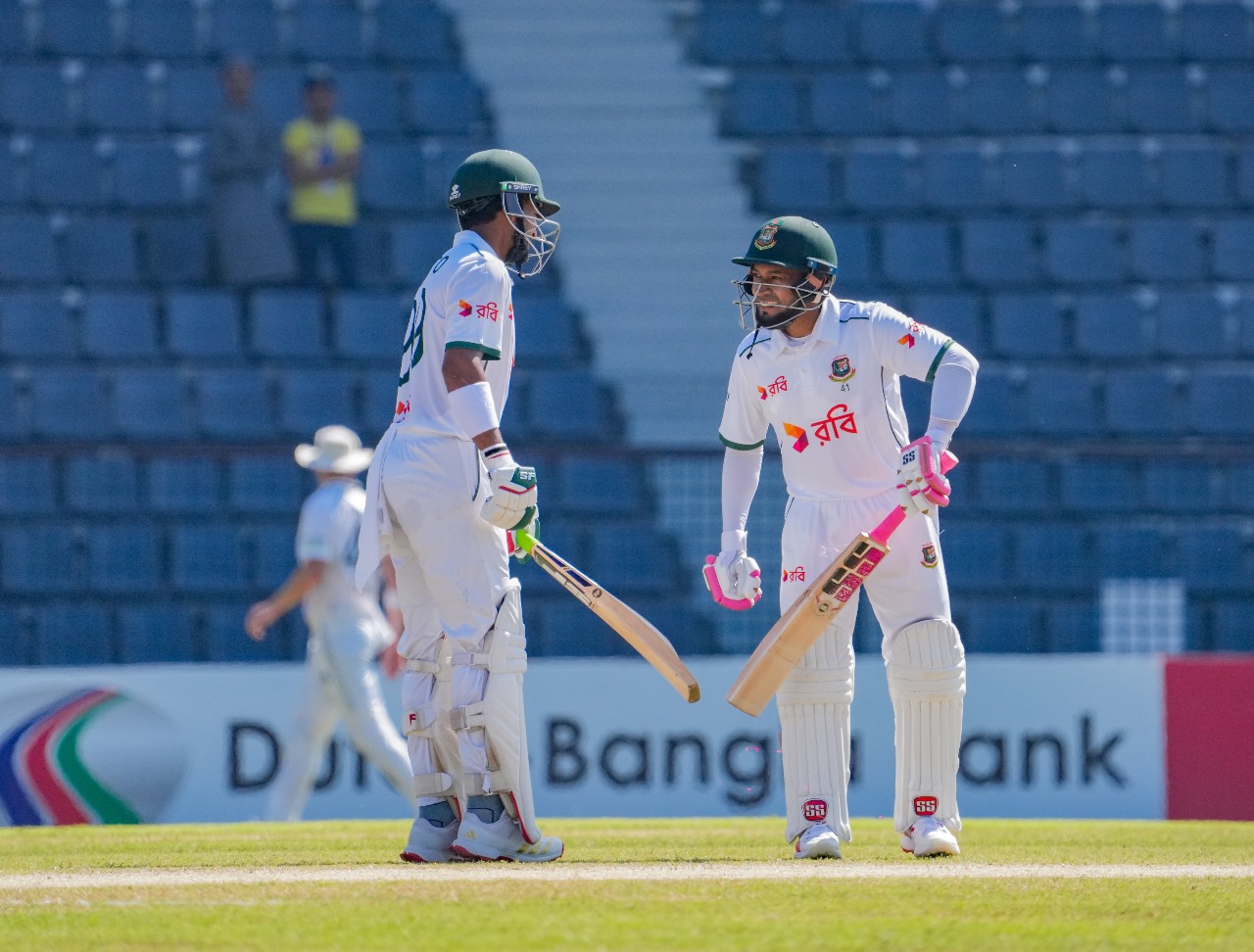 এর আগে সকালে ১ উইকেটে ৩৩৮ রান নিয়ে ব্যাটিং শুরু করে দ্রতই ২ উইকেট হারায় বাংলাদেশ। নতুন বলে ১৪ বলের মধ্যে বিদায় নেন মাহমুদুল হাসান জয় ও মুমিনুল হক। দিনের দ্বিতীয় ওভারে মাহমুদুল হাসান জয়কে ফিরিয়ে বড় জুটি ভাঙলেন ব্যারি ম্যাককার্থি। ম্যাককার্থির প্রথম দুই বলে আসে দুটি সিঙ্গেল।