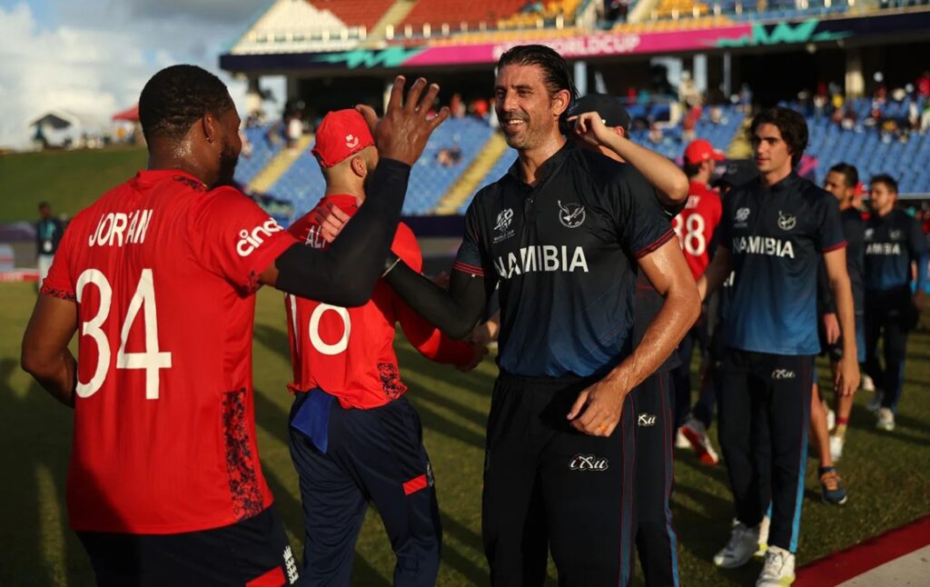 অ্যান্টিগার নর্থ সাউন্ডে, স্যার ভিভ রিচার্ড স্টেডিয়ামে চরম নাটকীয়তায় ভরা ম্যাচে টস হেরে ইংল্যান্ডকে ব্যাটিংয়ে পাঠায় নামিবিয়া। উইকেটের সুবিধা কাজে লাগিয়ে দ্বিতীয় ওভারেই ইংলিশ অধিনায়ক জস বাটলারের স্ট্যাম্প উপড়ে ফেলেন রুবেন ট্রাম্পেলম্যান। তৃতীয় ওভারের প্রথম বলে আরেক ওপেনার ফিল সল্টকে আউট করেন ডেভিড উইজে।