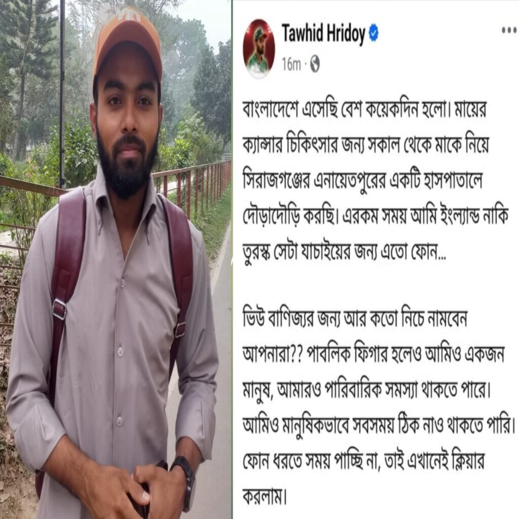 তিনি বৃহস্পতিবার বিকেল ৪টা ৫০ মিনিটে নিজের ফেসবুকে তাওহিদ হৃদয় লিখেন,‘বাংলাদেশে এসেছি বেশ কয়েকদিন হলো। মায়ের ক‍্যান্সার চিকিৎসার জন‍্য সকাল থেকে মাকে নিয়ে সিরাজগঞ্জের এনায়েতপুরের একটি হাসপাতালে দৌড়াদৌড়ি করছি। এরকম সময় আমি ইংল‍্যান্ড নাকি তুরস্ক সেটা যাচাইয়ের জন‍্য এতো ফোন…