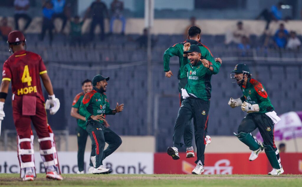 ২০৮ রানের জবাবে ব্যাটিংয়ে নেমে ওপেনিং জুটিতে ১২ ওভারে ৫১ রান তোলে ক্যারিবিয়ান ওপেনার ব্রেন্ডন কিং ও আলিথ আথানাজে! তবে মন্থর উইকেটে প্রথম ব্রেক থ্রো এনে দেন রিশাদ হোসেন। টানা ৭ ওভার বোলিং করে ২৫ রান দিয়ে একাই পাঁচ উইকেট তুলে নেন এই লেগ স্পিনার।