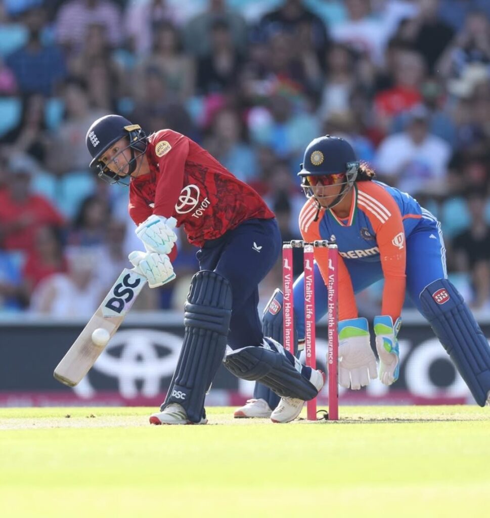 লক্ষ্য তাড়ায় শুরুটা দুর্দান্ত করে ইংল্যান্ড। পাওয়ারপ্লে শেষে স্কোর ছিল ৫৭/০। কিন্তু স্পিনাররা ম্যাচে ফেরান ভারতকে। রাধা যাদব ও দীপ্তি শর্মা ফিরিয়ে দেন দুই ওপেনারকে।