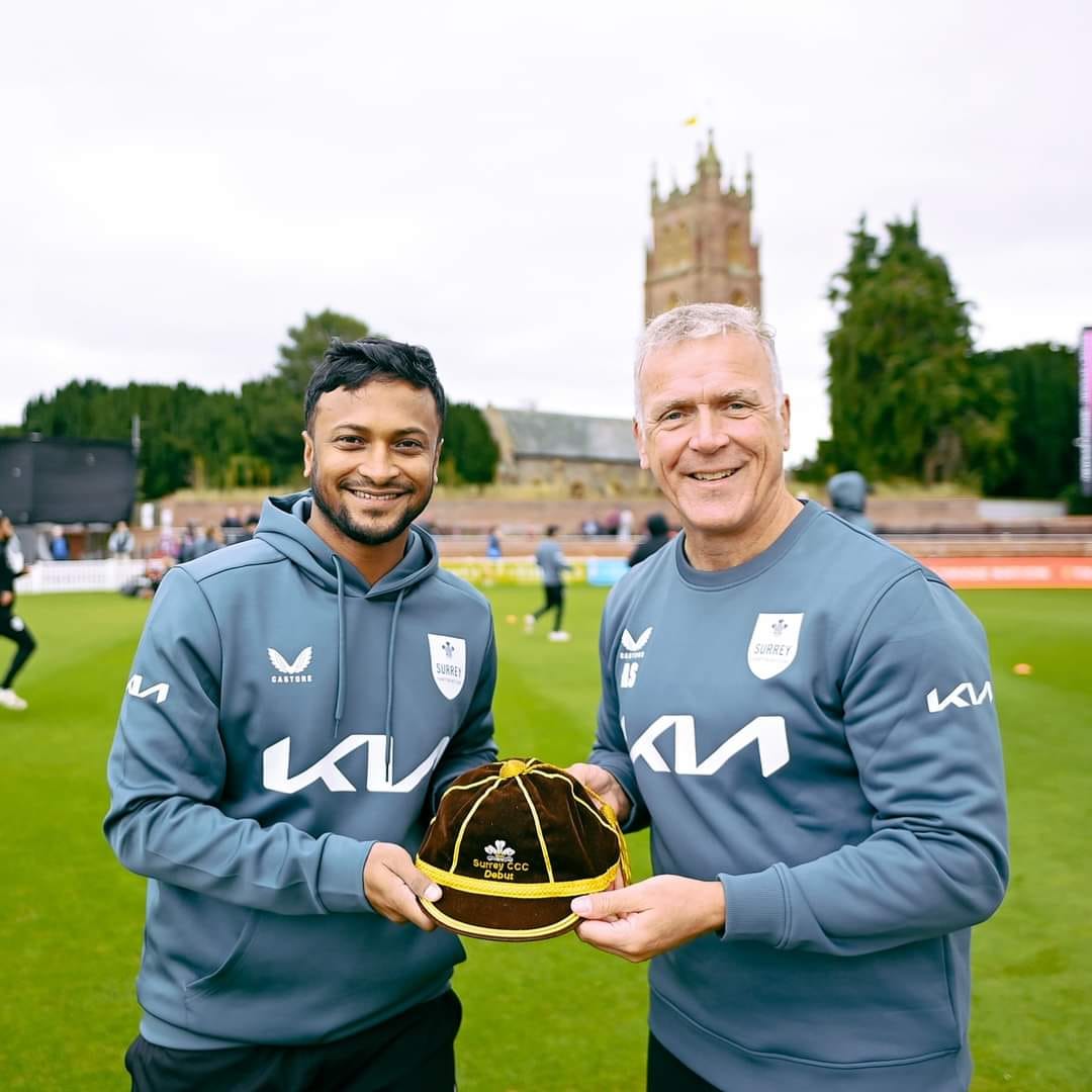 বাংলাদেশ সময় বিকেল সাড়ে তিনটায় শুরু হয়েছে খেলা। এর আগে সাকিবকে বরণ করে নেয় সারে ক্লাব। তাকে ডেব্যু ক্যাপ পরিয়ে দেন সতীর্থ পেসার কেমার রোচ।