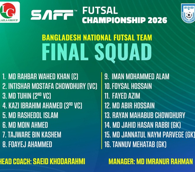 আগামী ১৩ ও ১৪ জানুয়ারি থেকে থাইল্যান্ডে যথাক্রমে সাফ নারী ও পুরুষ ফুটসাল টুর্নামেন্ট শুরু হবে। যেখানে দুই বিভাগেই অংশগ্রহণ করবে বাংলাদেশ। আজ বাফুফে নারী ও পুরুষ ১৬ জনের চূড়ান্ত স্কোয়াড ঘোষণা করেছে।