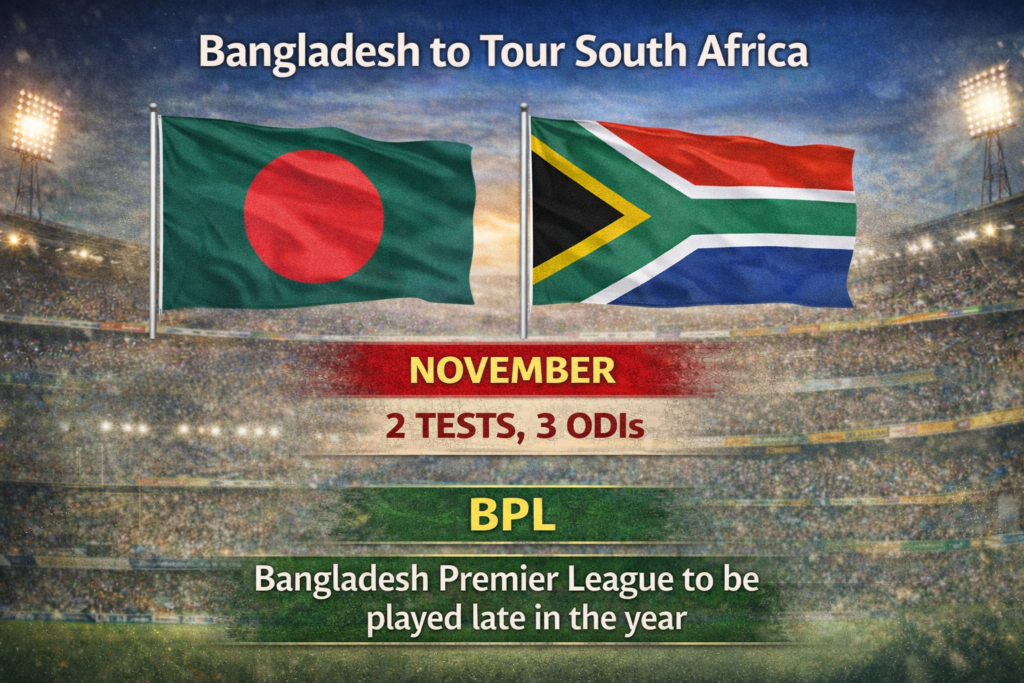 নভেম্বর মাসে দক্ষিণ আফ্রিকা সফরে যাবে বাংলাদেশ দল। নভেম্বরের মাঝামাঝি দক্ষিণ আফ্রিকা গিয়ে ২ টেস্ট, ৩ ওয়ানডের সিরিজ খেলবে বাংলাদেশ। সিরিজ শেষ হবে ডিসেম্বরের শুরুর দিকে।এই সিরিজ দিয়েই ২০২৬ সাল শেষ করবে বাংলাদেশ ক্রিকেট দল। বছরের শেষ ভাগে বিপিএল আয়োজনের জন্য রয়েছে ফাঁকা উইন্ডো। ঐ সময়ে মাঠে গড়ায় বাংলাদেশ প্রিমিয়ার লিগ বিপিএল।