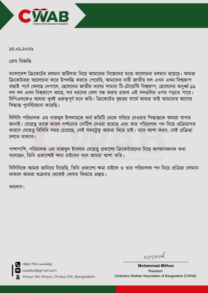 পাশাপাশি, পরিচালক এম নাজমুল ইসলাম যেহেতু প্রকাশ্যে ক্রিকেটারদের নিয়ে অপমানজনক কথা বলেছেন, তিনি প্রকাশ্যে ক্ষমা চাইবেন বলে আমরা আশা করি। বিসিবিকে আমরা জানিয়ে দিয়েছি, তিনি প্রকাশ্যে ক্ষমা চাইলে ও তার পরিচালক পদ নিয়ে প্রক্রিয়া চলমান থাকলে আমরা শুক্রবার থেকে খেলায় ফিরতে প্রস্তুত।