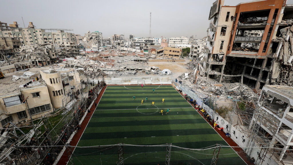 যুদ্ধের ভয়াবহ চিহ্ন মুছে যায়নি একটুও। এখনও গাজার মানুষ আছে যেকোনো মুহূর্তে হামলার আতঙ্কে। চারদিকে ধ্বংসস্তূপ, লম্বা সময় ধরে চলা দখলদার ইসরায়েলের হামলায় অক্ষত নয় কোনো ভবন। এমনকি বেশিরভাগ বাড়িই মাটির সঙ্গে মিশিয়ে দেওয়া হয়েছে। সেই যুদ্ধবিধ্বস্ত গাজার ধ্বংসস্তূপের মাঝে মাঠে গড়িয়েছে ফুটবল।