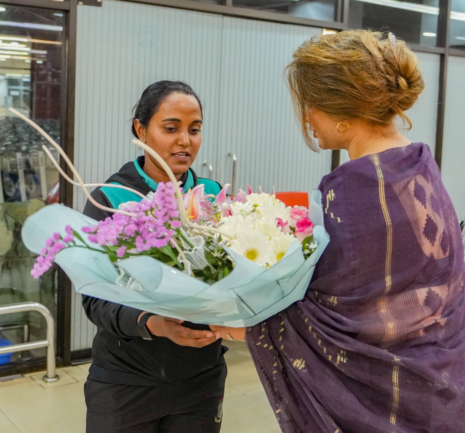 ক্রিকেটারদের মিষ্টি মুখ করান বিসিবি’র নারী বিভাগের চেয়ারম্যান রুবাবা দৌলা। ছবি: বিসিবি