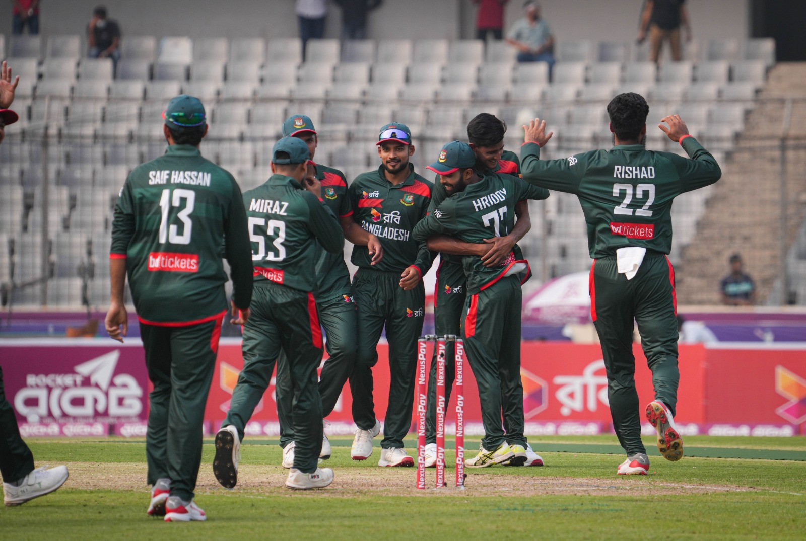 এরপর নিজের পরের চার ওভারের প্রতিটিতেই উইকেট তুলে নেন নাহিদ। তিনি যথাক্রমে শ্যামল হোসাইন, মাজ সাদাকাত, রিজওয়ান ও সালমান আলি আগাকে সাজঘরে ফেরান। টপ অর্ডার গুঁড়িয়ে দিয়ে পূর্ণ করেন ক্যারিয়ারের প্রথম ওয়ানডে ফাইফার।