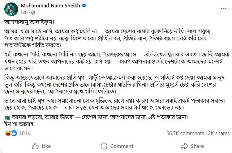 “আমরা যারা মাঠে নামি, আমরা শুধু খেলি না। দেশের নামটা বুকে নিয়ে নামি। লাল–সবুজ পতাকাটা শুধু শরীরে নয়, রক্তে মিশে থাকে। প্রতিটা বল, প্রতিটা রান, প্রতিটা শ্বাসে চেষ্টা করি সেই পতাকাটাকে গর্বিত করতে। হ্যাঁ, কখনো পারি, কখনো পারি না। জয় আসে, পরাজয়ও আসে—এটাই খেলাধুলার বাস্তবতা। জানি, আমরা যখন হেরে যাই, তখন আপনাদের কষ্ট হয়, রাগ হয়। কারণ আপনারাও এই দেশটাকে আমাদের মতোই ভালোবাসেন।”