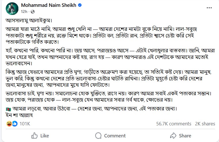 “ভালোবাসা চাই, ঘৃণা নয়। সমালোচনা হোক যুক্তিতে, রাগে নয়। কারণ আমরা সবাই একই পতাকার সন্তান। জয় হোক, পরাজয় হোক, লাল–সবুজ যেন আমাদের সবার গর্ব থাকে, ক্ষোভের নয়। আমরা লড়ব, আবার উঠব—দেশের জন্য, আপনাদের জন্য, এই পতাকার জন্য।”