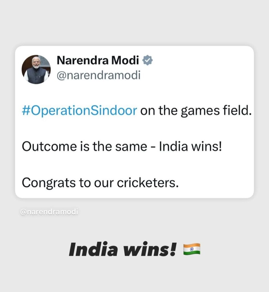 “খেলার মাঠে অপারেশন সিঁদুর। ফলাফল একই—ভারত জিতেছে! অভিনন্দন আমাদের ক্রিকেটারদের।”