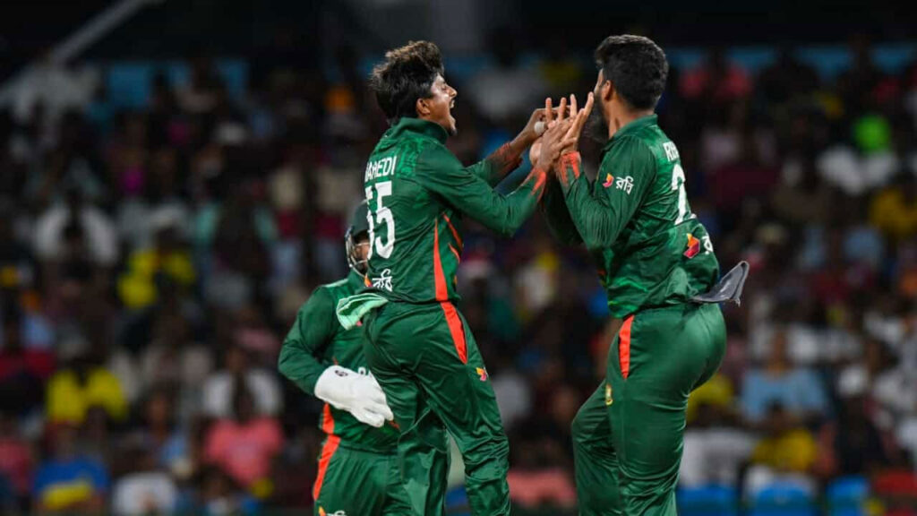 বাংলাদেশ: ১২৯/৭ (২০ ওভার)। (লিটন দাস ৩, সৌম্য সরকার ১১, তানজিদ হাসান ২, মেহেদি হাসান ২৬, জাকের আলী ২১, রিশাদ হোসেন ৫, মাহেদি ১১, শামীম ৩৫* ও তানজিম ৯*; আকিল ১/১৬, গুদাকেশ ২/২৫, রোস্টন ১/৮, আলঝারি ১/২১, ম্যাকয় ১/৩২)।