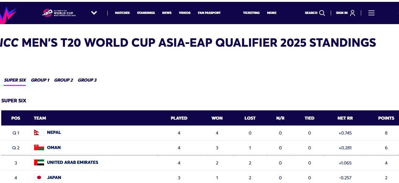 সুপার সিক্স রাউন্ডে নেপাল এখন চার ম্যাচে সবকটিতে জয় অর্জন করে ৮ পয়েন্ট নিয়ে সবার শীর্ষে রয়েছে। সমান ম্যাচে ওমান কেবল একটি হারে ৬ পয়েন্ট পেয়েছে। এর আগে সংযুক্ত আরব আমিরাত সামোয়ার বিপক্ষে ৭৭ রানের বড় ব্যবধানে জয় পায়। আগে ব্যাট করা আমিরাত ২২৫ রানের লক্ষ্য স্থির করেছিল। লক্ষ্য তাড়ায় সামোয়া ৮ উইকেটে ১৪৮ রান তুলতে সক্ষম হয়। এই জয় দিয়ে বিশ্বকাপে খেলার আশা বাঁচিয়ে রেখেছে সংযুক্ত আরব আমিরাত।