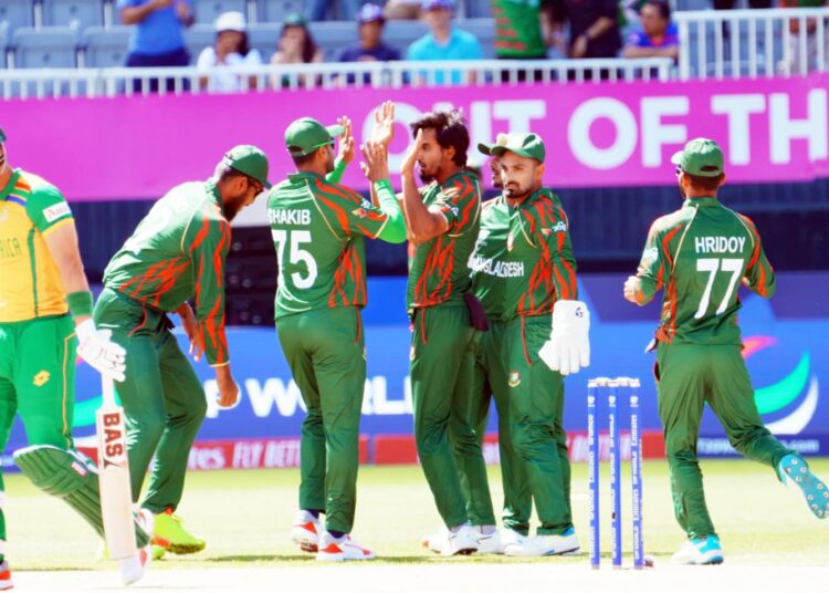 আলোচিত-সমালোচিত নিউইয়র্কের নাসাউ আন্তর্জাতিক ক্রিকেট স্টেডিয়ামে টস জিতে আগে ব্যাটিং নেয়া প্রোটিয়ারা প্রথম ওভারেই উইকেট হারায়। ওভারের শেষ বলে তানজিম হাসান সাকিবের বলে গোল্ডেন ডাক মারেন ওপেনার রিজা হেনড্রিক্স।