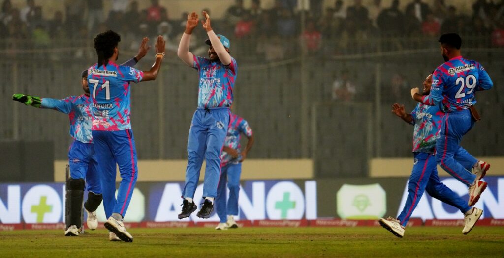 চিটাগংয়ের পক্ষে দু’টি করে উইকেট পেয়েছেন বিনুরা ফার্নান্দো ও আলিস আল ইসলাম। এছাড়া একটি করে উইকেট তুলে নিয়েছেন খালেদ আহমেদ ও আরাফাত সানী।