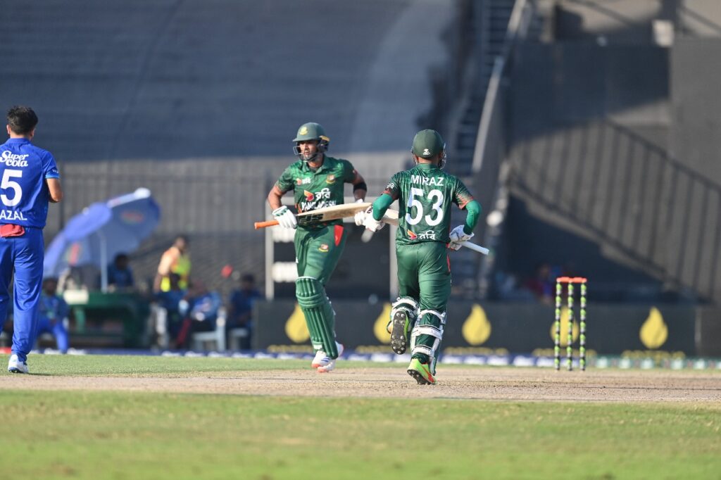 টস জিতে ব্যাটিংয়ে নেমে ৫০ ওভারে ৮ উইকেটে ২৪৪ রান সংগ্রহ করে বাংলাদেশ। দলের হয়ে সর্বোচ্চ ৯৮ রান করেন মাহমুদউল্লাহ, যার ইনিংসটি ছিল ৭টি চারের পাশাপাশি তিনটি ছক্কায় সমৃদ্ধ। এদিকে, মিরাজও গুরুত্বপূর্ণ ৬৬ রান করে যান। দুজনের ১৪৫ রানের জুটি এই ম্যাচে বাংলাদেশকে শক্ত ভিত্তি দেয়।