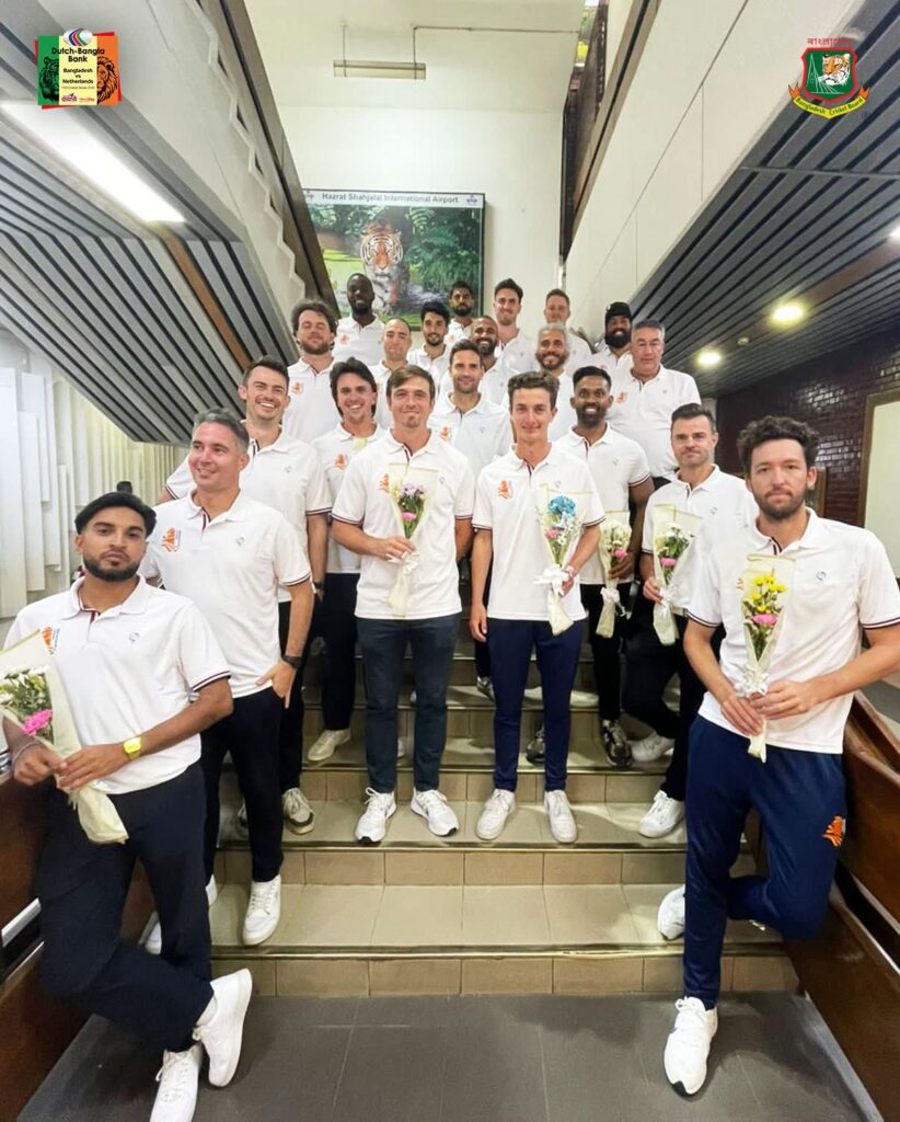 তিন ম্যাচের টি-টোয়েন্টি সিরিজ খেলতে আজ (বুধবার) সকালে ঢাকায় এসে পৌঁছেছে নেদারল্যান্ডস ক্রিকেট দল। হযরত শাহজালাল আন্তর্জাতিক বিমানবন্দরে তিন ঘণ্টার মতো অবস্থান করার পর দুপুর ১২টা ৪০ মিনিটে সিলেটের উদ্দেশে রওনা দেয় তারা। এরই মধ্যে সিলেটে পৌঁছেছে সফরকারীরা।
