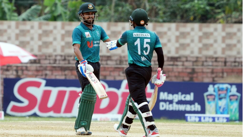 জবাবে ব্যাটিংয়ে নেমে ৪৭.২ ওভারে ২১৩ রানে গুটি যায় অগ্রণী ব্যাংক। দলের পক্ষে সেঞ্চুরি করেও দলকে জেতাতে পারেনি অমিত হাসান। ১২৩ বলে সাত বাউন্ডারি ও এক ছক্কায় ১০৫ রান করেন। এছাড়া অধিনায়ক মার্শাল আইয়্যূব ৩৭ রান করেন। এছাড়া আর কোন ব্যাটার সুবিধা করতে পারেনি।