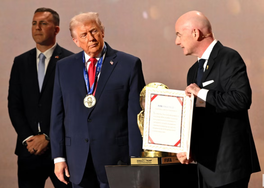 অনেকবারই নোবেল শান্তি পুরস্কার পাওয়ার আশা থেকে নানা কথা বলেছেন মার্কিন যুক্তরাষ্ট্রের প্রেসিডেন্ট ডোনাল্ড ট্রাম্প। তবে নোবেল কমিটি তাকে সেই পুরস্কার দেয়নি। তবে শুক্রবার ‘শান্তি পুরস্কার’ পেয়ে গেলেন তিনি। বিশ্ব ফুটবলের সর্বোচ্চ নিয়ন্ত্রক সংস্থা (ফিফা) তাকে ‘ফিফা শান্তি পুরস্কার’ প্রদান করেছে। ফিফা এ পুরস্কার এবারই চালু করেছে।