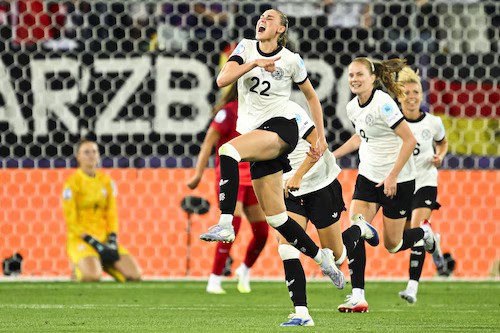 নারী ইউরোপিয়ান চ্যাম্পিয়নশিপ ফুটবলে টানা দ্বিতীয় জয় পেয়েছে জার্মানি। মঙ্গলবার ডেনমার্কের বিপক্ষে পিছিয়ে পড়ার পরও ২-১ গোলে হারিয়ে তারা কোয়ার্টার ফাইনালে খেলা নিশ্চিত করেছে। দুই ম্যাচ থেকে ৬ পয়েন্ট নিয়ে গ্রুপে দ্বিতীয় স্থানে রয়েছে আটবারের চ্যাম্পিয়ন দলটি। সমান ম্যাচে সমান পয়েন্ট নিয়ে সুইডেন গ্রুপে নেতৃত্ব দিচ্ছে। সমান ম্যাচে গ্রুপের অপর দুই দল ডেনমার্ক ও পোল্যান্ডের ভান্ডার এখনো শূন্য।