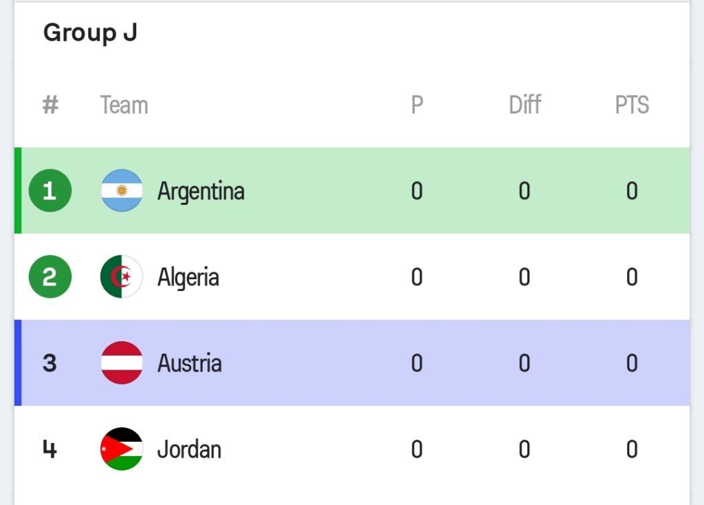 ড্র অনুযায়ী মেসিদের আর্জেন্টিনা পড়ে গ্রুপ জে তে। তাদের সঙ্গে এই গ্রুপে আছে আলজেরিয়া, অস্ট্রিয়া এবং জর্ডান। তুলনামূলকভাবে এই গ্রুপটিকে বেশ সহজ বলেই মনে করছেন ফুটবল বিশ্লেষকরা।