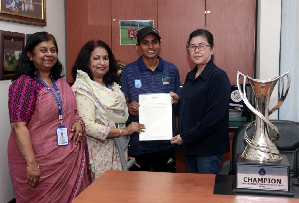 সাউথ এশিয়ান ফুটবল ফেডারেশন (সাফ) আয়োজিত ‘সাফ ওমেন্স চ্যাম্পিয়নশিপ ২০২৪’ এ অপরাজিত চ্যাম্পিয়ন হয়ে দেশের জন্য গৌরব বয়ে আনার জন্য বাংলাদেশ মহিলা জাতীয় ফুটবল দলকে অভিনন্দন জানিয়েছে বাংলাদেশ ব্যাংক। এই উপলক্ষে বাফুফে ভবনে গিয়ে বাংলাদেশ ফুটবল ফেডারেশন (বাফুফে) এর নির্বাহী কমিটির সদস্য ও ওমেন্স উইংয়ের চেয়ারম্যান মাহফুজা আক্তার কিরন এবং জাতীয় দলের অধিনায়ক সাবিনা খাতুনের হাতে আনুষ্ঠানিক অভিনন্দন পত্র তুলে দেন বাংলাদেশ ব্যাংক কর্তৃপক্ষ।