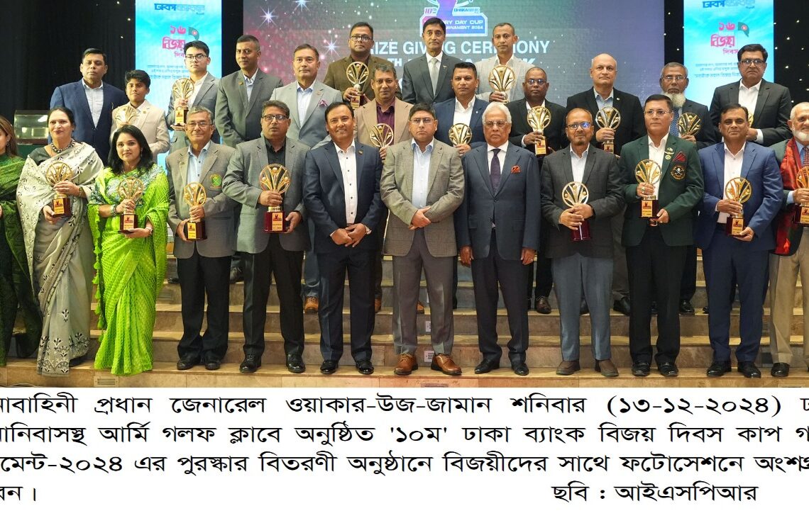আর্মি গলফ ক্লাব, ঢাকা সেনানিবাসে ‘১০ম ঢাকা ব্যাংক বিজয় দিবস কাপ গলফ টুর্নামেন্ট-২০২৪’ এর সমাপনী অনুষ্ঠিত হয়েছে। অনুষ্ঠানে প্রধান অতিথি হিসেবে উপস্থিত থেকে টুর্নামেন্টে বিজয়ীদের মাঝে পুরস্কার বিতরণ করেন সেনাবাহিনী প্রধান জেনারেল ওয়াকার-উজ-জামান।