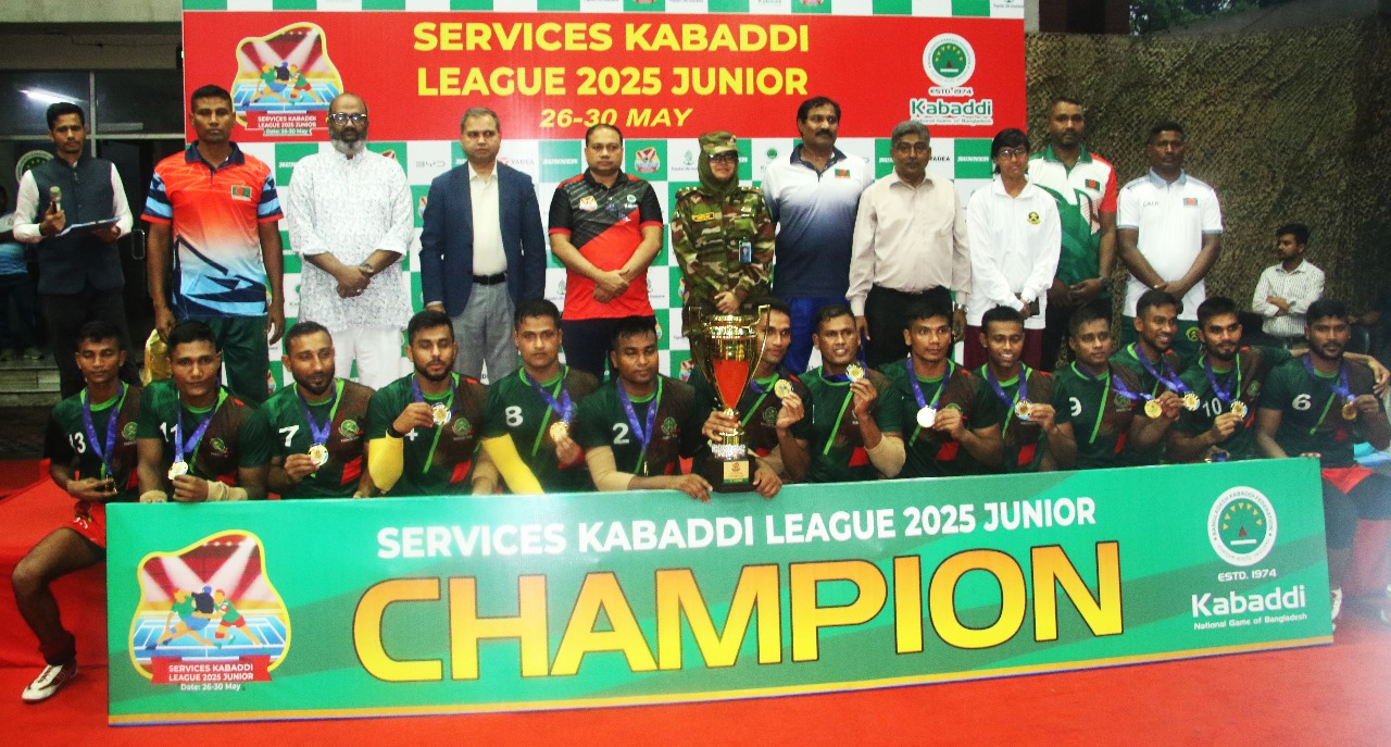 সার্ভিসেস কাবাডি লিগে (জুনিয়র) অপরাজিত চ্যাম্পিয়ন হয়েছে বাংলাদেশ সেনাবাহিনী। ফাইনালে তারা বাংলাদেশ পুলিশকে ৪১-২৫ পয়েন্টের ব্যবধানে হারিয়েছে।