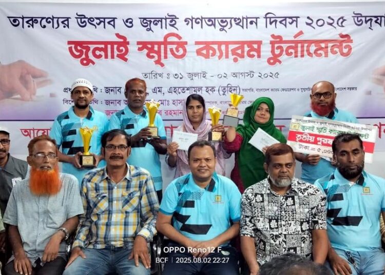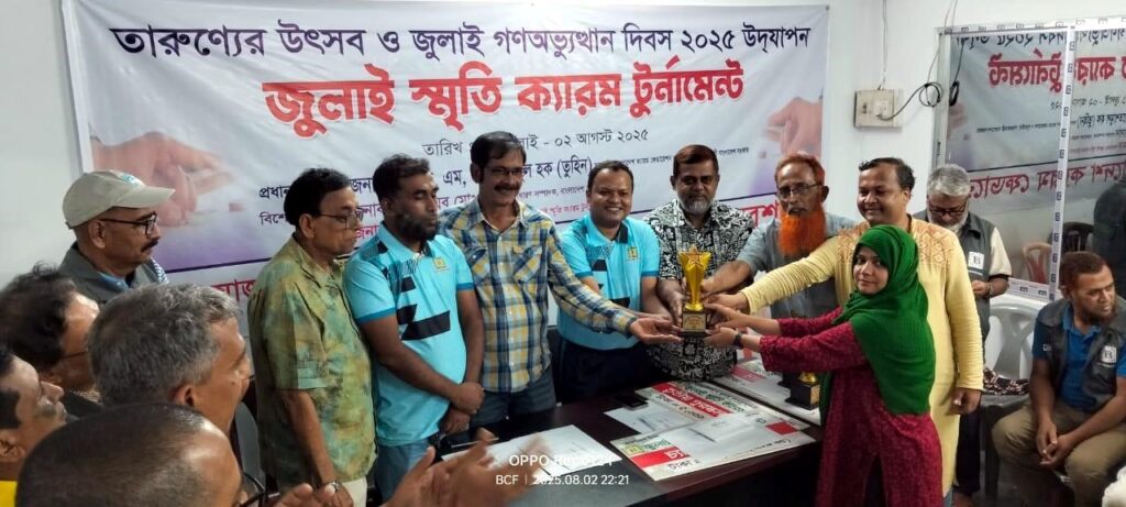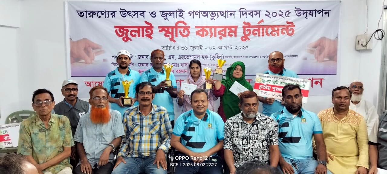 তারুণ্যের উৎসব ও জুলাই গণঅভ্যুত্থান দিবস ২০২৫ উদযাপনের লক্ষ্যে ‘জুলাই স্মৃতি ক্যারম টুর্নামেন্টের আয়োজন করেছিলো বাংলাদেশ ক্যারম ফেডারেশন। তিনদিনের এই টুর্নামেন্টে পুরুষ ও নারী এককে চ্যাম্পিয়ন হয়েছেন মো. আলী রবিন ও আফসানা নাসরিন।