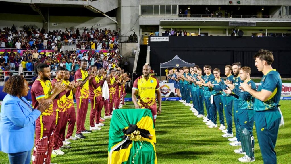জ্যামাইকার পতাকায় মোড়ানো স্মারক ব্যাট বল। আছেন দেশটির ক্রীড়ামন্ত্রী অলিভিয়া গ্রেঞ্জ। দুই পাশে দাঁড়ানো ওয়েস্ট ইন্ডিজ ও অস্ট্রেলিয়া দল। অন্যদিকে সিঁড়ি থেকে নেমে এলেন আন্দ্রে রাসেল। তাকে দেওয়া হলো গার্ড অব অনার।