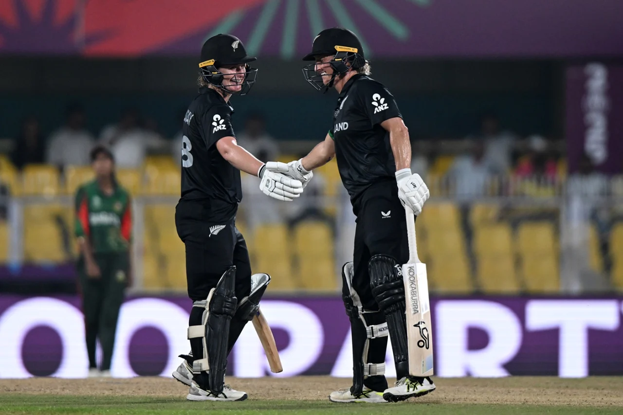 সুজি বেটস ও জর্জিয়া প্লিমারের ৩৫ রানের উদ্বোধনী জুটির পর জোড়া আউটের পর দলীয় ৩৮ রানে তৃতীয় উইকেট হারায় কিউই নারীরা। সেখান থেকে অধিনায়ক সোফি ডিভাইন ও ব্রুক হ্যালিডে সাবেক বিশ্বচ্যাম্পিয়নদের শতরানের জুটি উপহার দেন।