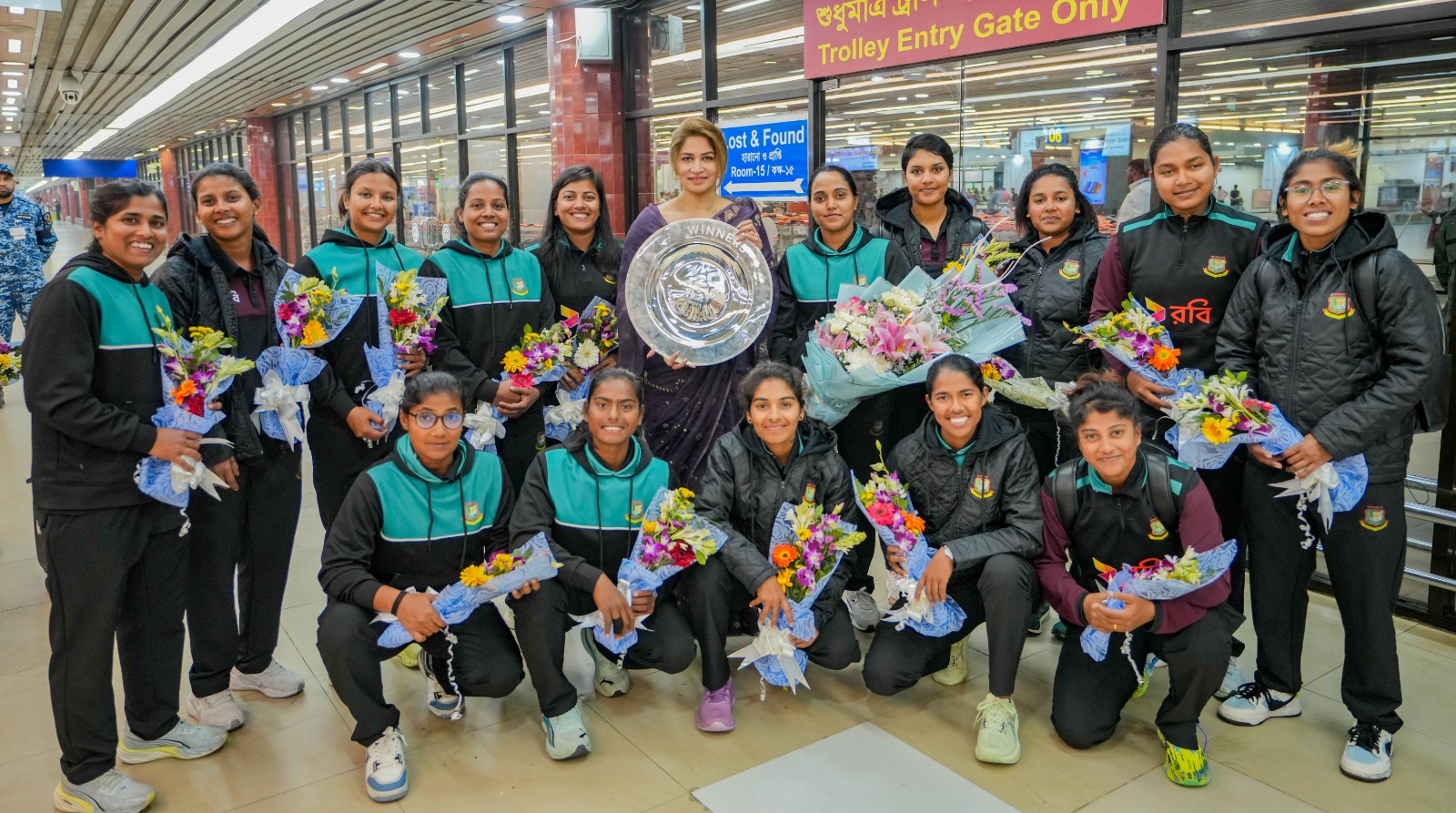 গত রবিবার শেষ ম্যাচে নেদারল্যান্ডসকে ৭ উইকেটের বড় ব্যবধানে হারিয়ে চ্যাম্পিয়ন হয় নিগার সুলতানার দল। তারপর দেশে ফিরেছে নারী দল। তারা দেশের মাটিতে পা রাখলে ক্রিকেটারদের ফুল দিয়ে শুভেচ্ছা জানান বিসিবি’র নারী বিভাগের চেয়ারম্যান রুবাবা দৌলা। সেখানে তাদের মিষ্টি মুখ করান তিনি।