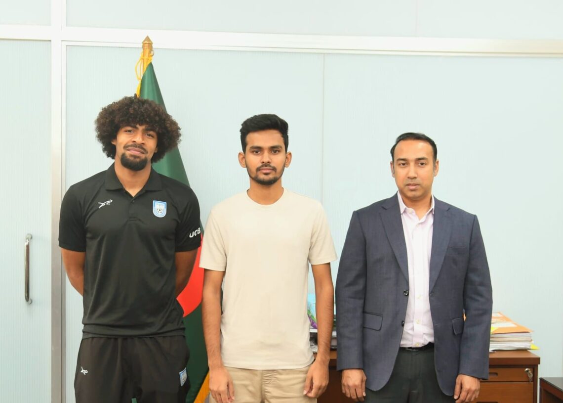 আজ (বুধবার) দুপুর আড়াইটায় রাজধানীর নগর ভবনে যুব ও ক্রীড়া মন্ত্রণালয় এবং স্থানীয় সরকার, পল্লী উন্নয়ন ও সমবায় মন্ত্রণালয়ের উপদেষ্টা আসিফ মাহমুদ সজীব ভূঁইয়ার সঙ্গে সৌজন্য সাক্ষাৎ করেন বাংলাদেশ ফুটবলের নতুন সম্ভাবনা হামজা চৌধুরী। এসময় তার সঙ্গে উপস্থিত হয়ে ফুটবলে সৃষ্ট চলমান সঙ্কট নিয়ে ক্রীড়া উপদেষ্টার সঙ্গে আলোচনায় বসেন বাংলাদেশ ফুটবল ফেডারেশনের (বাফুফে) সভাপতি তাবিথ আউয়াল।